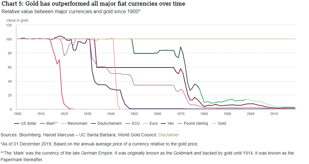Goud versus valuta sinds 1900 (Bron: World Gold Council)
