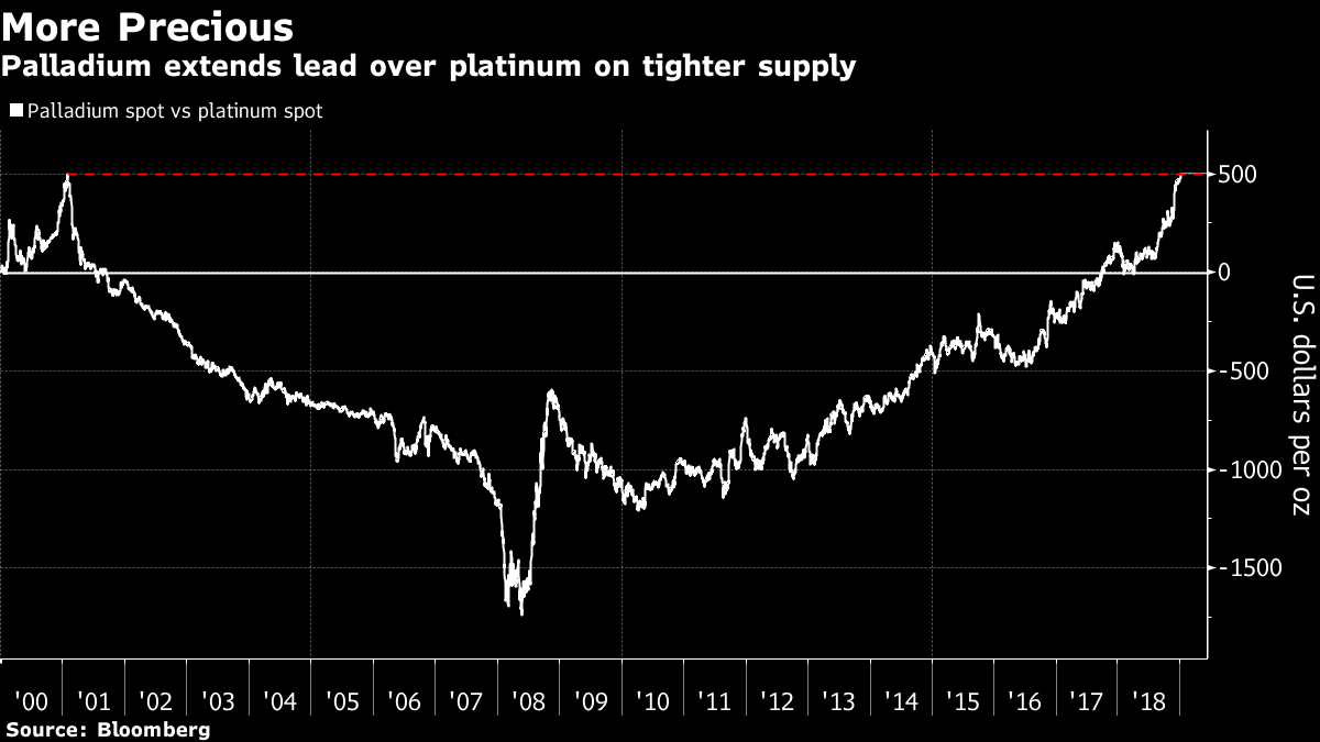 Door de prijsstijging van de afgelopen jaren is palladium ook een stuk duurder geworden dan platina, terwijl die verhouding historisch gezien meestal omgekeerd was. Het prijsverschil is inmiddels zelfs opgelopen tot $500 per troy ounce, het hoogste niveau sinds het begin van deze eeuw. In 2008 waren de rollen nog omgekeerd, toen een troy ounce platina ruim $1.500 duurder was.