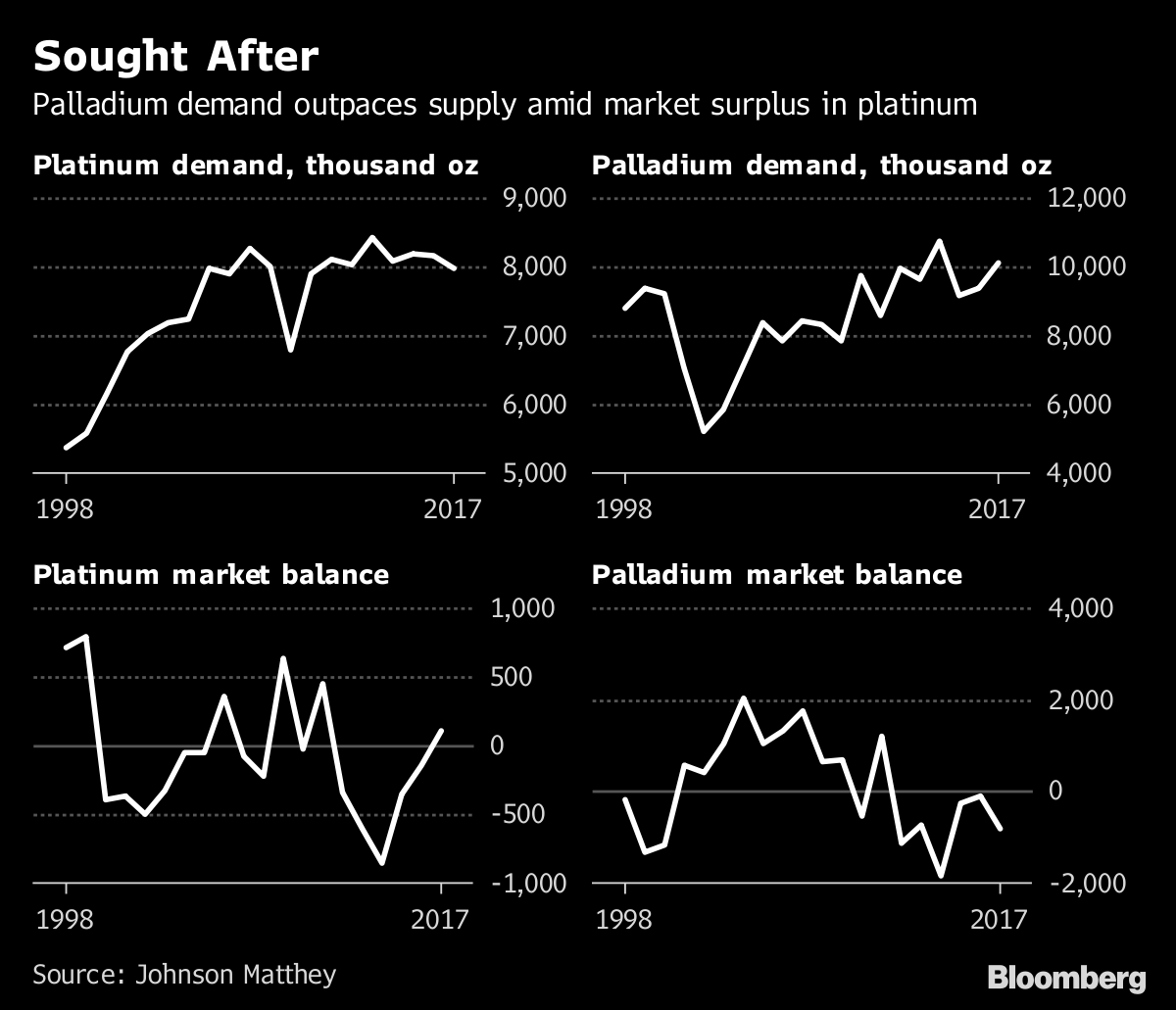 Palladium wordt veel gebruikt in benzineauto's en profiteert van een toegenomen vraag naar dit type voertuigen. Platina wordt gebruikt in dieselauto's, die door het schandaal bij Volkswagen minder populair zijn geworden. Ook worden deze auto's zwaarder belast, omdat ze meer vervuilend zijn dan benzine-auto's. Door deze ontwikkelingen zakte de prijs van platina naar $821,35 per troy ounce, het laagste niveau in tien jaar tijd.