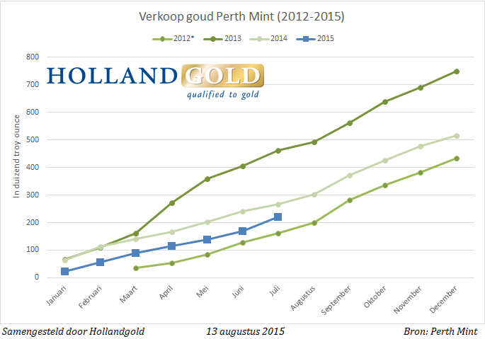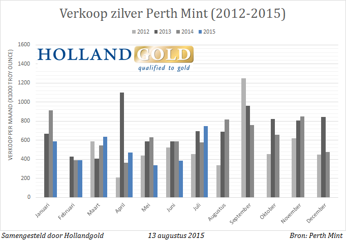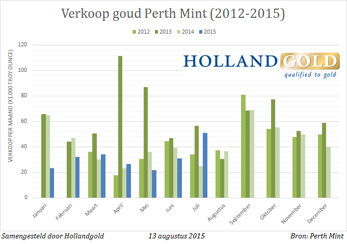 Ten opzichte van de maand juni wist het munthuis bijna 65% meer goud en zelfs 91% meer zilver te verkopen. Beleggers van over de hele wereld zagen de daling van de goudkoers en de zilverkoers als een goed moment om in te stappen. De goudprijs in dollars bereikte het laagste niveau in ruim vijf jaar, terwijl zilver in zes jaar niet meer zo goedkoop is geweest als nu.