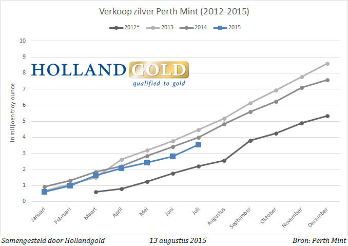 In de eerste zeven maanden van dit jaar heeft de Perth Mint in totaal bijna 220.000 troy ounce goud verkocht. Dat is ongeveer 15% minder dan vorig jaar om deze tijd en ruim 52% minder dan in recordjaar 2013. Van januari tot en met juli heeft het Australische munthuis ruim 3,55 miljoen troy ounce aan zilver verkocht, dat is ongeveer 11% minder vorig jaar en ruim 20% minder dan in recordjaar 2013.