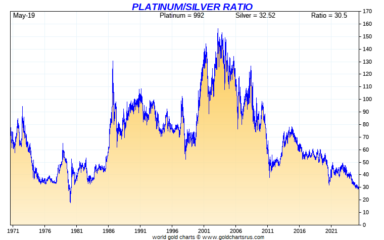 De platina/zilverratio bereikt hiermee één van de laagste niveau's van de voorbije 55 jaar. Gelijkaardige lage niveau's werden enkel bereikt tijdens de pieken van de zilverprijs in 2011 en eind jaren 1970. Gedurende de voorbije decennia waren er langdurige periodes waarbij platina veel meer waard was, van ongeveer 80 zilverounces tijdens de jaren 1990 tot 140 zilverounces voor 1 ounce platina begin jaren 2000. Algemeen kan gesteld worden dat platina relatief duur is bij een platina/zilver ratio van 90 of meer. Anderzijds is zilver relatief duur bij een platina/zilver ratio die onder 50 noteert. De huidige situatie toont aan dat platina historisch goedkoop is, zowel ten opzichte van goud als van zilver.