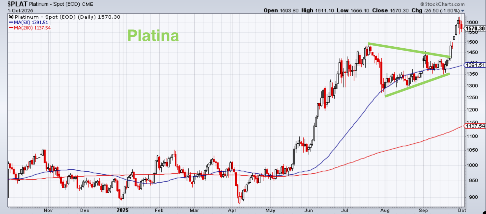 Na de forse stijging tussen april en juli, maakte de platinaprijs een logische zijwaartse correctie van een 2-tal maanden. Maar met de goudprijs en zilverprijs die de laatste weken hoger knallen, hoefde platina niet lang te wachten om een nieuwe versnelling hoger te schakelen