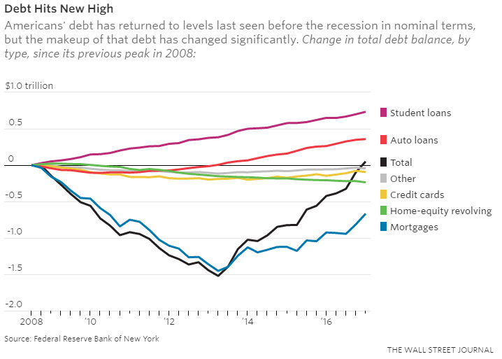 Private schulden weer groter dan voor de crisis (Grafiek via Wall Street Journal)