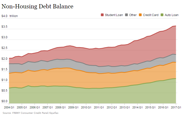 De totale private van Amerikaanse huishoudens waren in het eerste kwartaal van dit jaar voor het eerst weer groter dan de piek van 2008, vlak voor het uitbreken van de wereldwijde kredietcrisis. De kredietverlening is de laatste jaren weer sterk toegenomen door de combinatie van een extreem lage rente en een verbeterd consumentenvertrouwen.