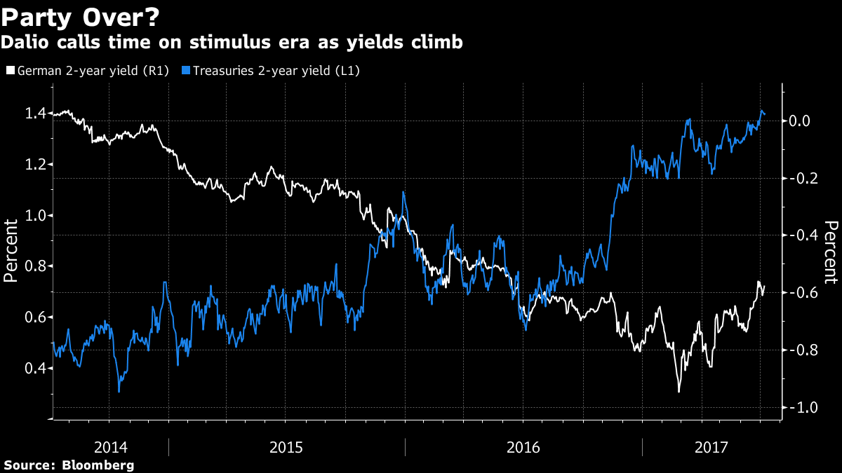 Hedgefondsmanager Dalio verwijst naar de toespraak van Draghi van ruim een week geleden, waaruit bleek dat ook de ECB bereid is het stimuleringsprogramma af te bouwen. Ook aan de andere kant van de wereld hangt er verandering in de lucht, want de Bank of Japan koopt de laatste maanden aanzienlijk minder staatsobligaties op. Daardoor is ook de lange rente in Japan weer wat verder opgelopen.