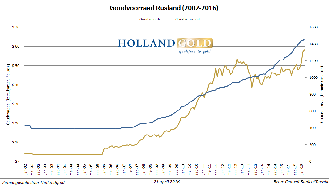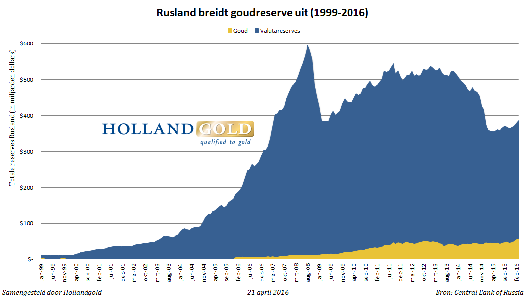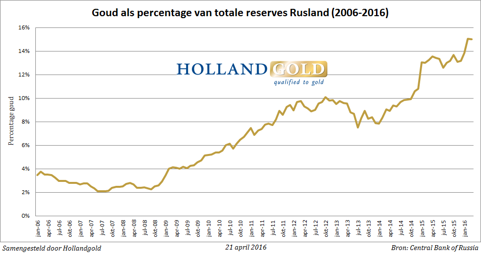 Sinds 2006 heeft Rusland meer dan 1.000 ton goud aan haar reserves toegevoegd en steeg de waarde van het edelmetaal ten opzichte van de totale reserves van 3% naar 15%. Van alle centrale banken in de wereld kocht die van Rusland vorig jaar misschien wel het meeste goud, namelijk 206 ton. China kocht met honderd ton in de tweede helft van 2015 een vergelijkbare hoeveelheid.