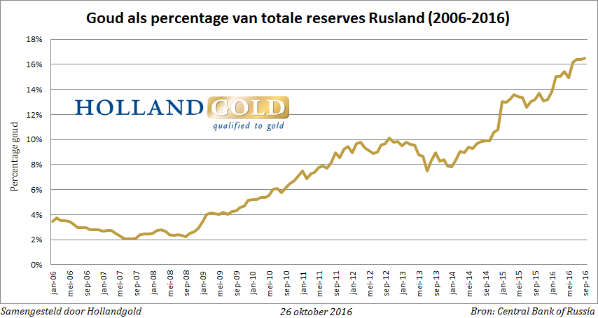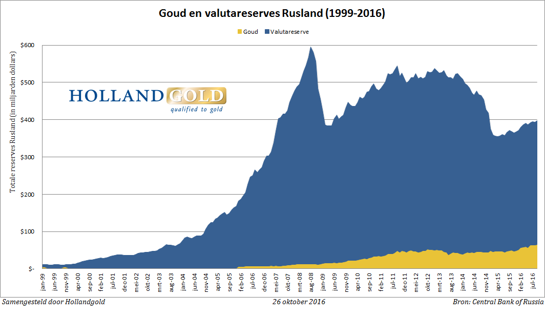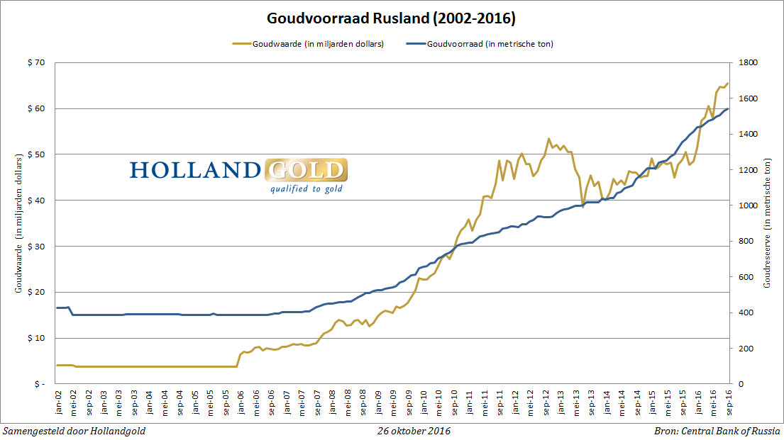 De centrale bank van Rusland heeft sinds het begin van dit jaar ruim 127 ton goud aan haar reserves toegevoegd. Sinds het uitbreken van de crisis heeft het land al meer dan 1.000 ton van het gele metaal aan haar kluis toegevoegd. Rusland wil minder afhankelijk worden van de dollar en zoekt daarom diversificatie in andere valuta en in goud. Onlangs zei president Poetin in een interview dat haar reserves nu al voor 30% uit euro's bestaan. Vergeleken met de totale reserves van bijna $400 miljard vertegenwoordigt het goud een aandeel van ruim 16%.