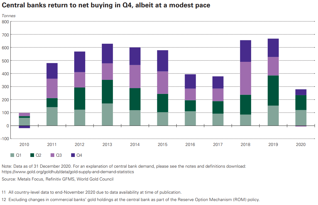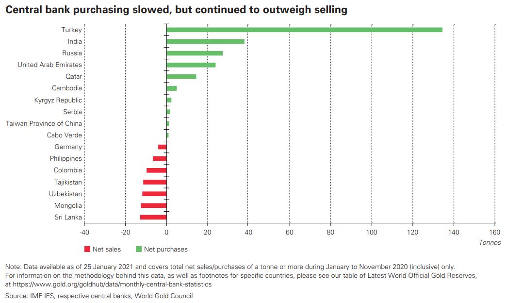 Centrale banken kochten vorig jaar veel minder goud dan afgelopen jaren. In het derde kwartaal waren ze voor het eerst in tien jaar zelfs netto verkopers van het edelmetaal. Dat komt vooral door de afwezigheid van grote afnemers als China en Rusland, landen die de laatste jaren nog het meeste edelmetaal aan hun reserves toevoegden. Turkije kocht nog wel op grote schaal bij, maar moest door economische problemen af en toe ook weer wat verkopen. De centrale banken van sommige opkomende economieën moesten door de coronacrisis juist goud verkopen.