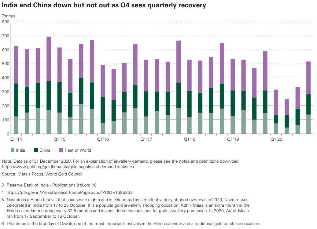 De markt voor gouden sieraden wordt gedomineerd door China en India. Deze twee landen zijn samen goed voor bijna de helft van de wereldwijde vraag. De coronacrisis kwam daar hard aan, want de wereldwijde vraag naar sieraden daalde naar het laagste niveau ooit gemeten door de World Gold Council. Door de slechte economische vooruitzichten kochten Chinezen en Indiërs veel minder sieraden dan normaal.