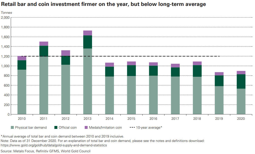 De wereldwijde vraag naar munten en baren steeg vorig jaar met slechts 3% naar 896,1 ton. De stijging is beperkt omdat er ook veel goudbaren op de markt kwamen, met name in landen als China en India. In die landen verkocht men juist goud om weggevallen inkomsten aan te vullen. Het waren vooral Westerse economieën waar de vraag naar het edelmetaal sterk toenam, gedreven door onrust op de financiële markten en de extreem lage rente.