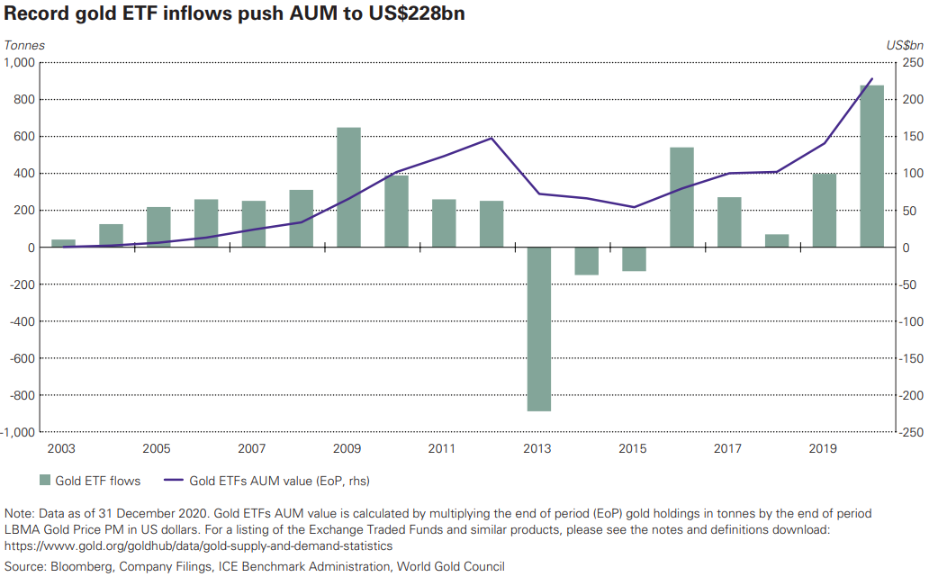 De wereldwijde vraag naar beleggingsgoud steeg vorig jaar met 40% naar een record van 1.773 ton. Dat schrijft de World Gold Council deze week in haar nieuwste rapport over de goudmarkt. Deze stijging komt bijna volledig voor rekening van goud-ETF's, beleggingsproducten die fysiek goud als onderpand aanhouden. Deze fondsen voegden het afgelopen jaar 877,1 ton goud aan hun reserves toe, meer dan een verdubbeling ten opzichte van 2019. Door de tegenvallende vraag naar gouden sieraden en een daling van de goudaankopen door centrale banken viel de totale vraag naar het edelmetaal echter lager uit.