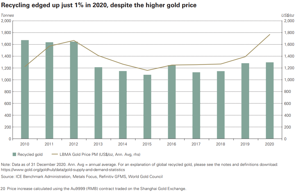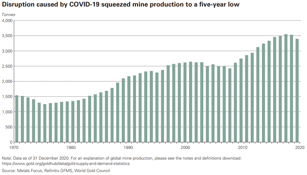 Ondanks de stijging van de goudkoers kwam er vorig jaar minder edelmetaal op de markt. Veel goudmijnen hadden last van de coronamaatregelen, waardoor ze tijdelijk hun productie moesten stilleggen. Daardoor daalde de wereldwijde productie van goudmijnen met 4% naar 3.401 ton. Ook opvallend is dat er vorig jaar, ondanks de aanzienlijk hogere goudprijs, nauwelijks meer sloopgoud op de markt kwam dan in 2019. Het zogeheten secundaire aanbod steeg met slechts 1% naar 1.297,4 ton. Dat kan betekenen dat mensen minder bereid zijn om hun goud te verkopen of dat veel sloopgoud al is ingeleverd.