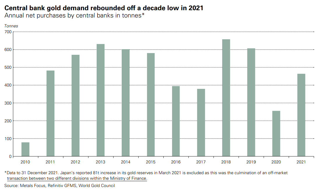 Centrale banken kochten veel meer goud in 2021 (Bron: World Gold Council)