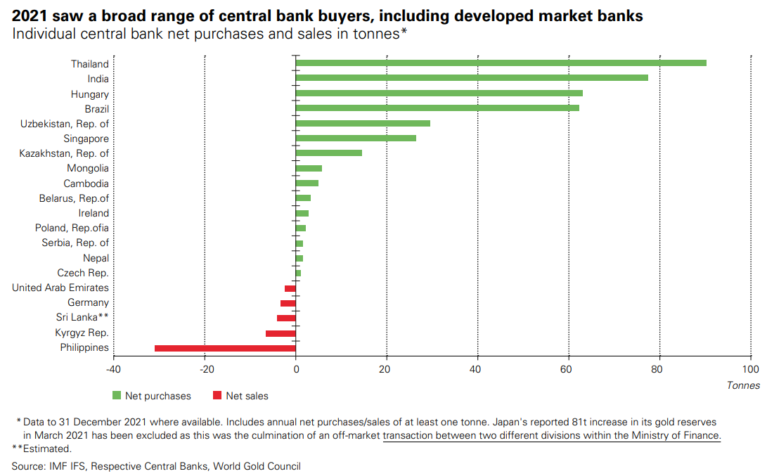 De grootste aankopen kwamen vorig jaar voor rekening van Thailand, India, Hongarije en Brazilië. Ook Oezbekistan, Singapore en Kazachstan voegde een substantiële hoeveelheid goud aan hun reserves toe. Voor Singapore was het de eerste aankoop in meer dan 21 jaar, toen de World Gold Council deze data begon bij te houden. Een andere opvallende koper was Ierland, dat voor het eerste sinds 2008 goud kocht. De centrale bank van de Filipijnen was de enige substantiële verkoper met een verkoop van meer dan 30 ton.
