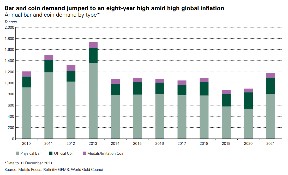 Beleggers en spaarders kochten wereldwijd meer beleggingsgoud, maar om verschillende redenen. In westerse landen gaf de lage rente en oplopende inflatie een impuls aan de markt, waarbij de voorkeur verschoof van goud-ETF's naar fysieke munten en baren. Zo steeg de vraag naar munten en baren in de Verenigde Staten vorig jaar met 69% naar een nieuw record van 117 ton. De US Mint verkocht 1,25 miljoen troy ounce aan gouden Eagle en Buffalo beleggingsmunten. Dat was het grootste volume sinds 2009.