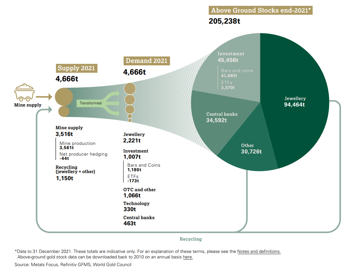 Totale bovengrondse goudvoorraad in perspectief (Bron: World Gold Council)