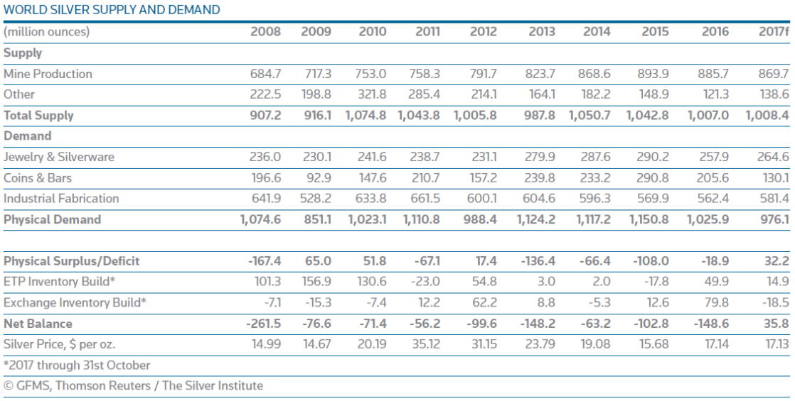 Cijfers van Thomson Reuters GFMS laten zien dat er dit jaar naar schatting 130,1 miljoen troy ounce gebruikt zal worden voor de productie van zilveren munten en baren, veel minder dan de 205,6 miljoen troy ounce in 2016 en 290,8 miljoen troy ounce in 2015. De instroom van exchange-traded funds liep ook terug, van 49,9 miljoen troy ounce in 2016 tot naar verwachting 14,9 miljoen troy ounce dit jaar.