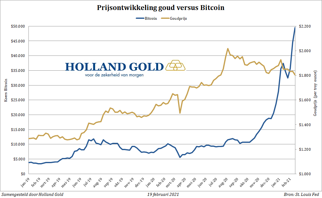 Een derde mogelijke verklaring voor de dalende goudprijs is dat meer beleggers nu Bitcoin kopen. Sinds begin dit jaar is de prijs van de virtuele munt al meer dan verdubbeld tot $50.000. Naast particulieren stappen ook steeds meer institutionele partijen in Bitcoin. Tesla kocht voor $1,5 miljard aan Bitcoin, terwijl MicroStrategy met een nieuwe aandelenemissie nog eens $600 miljoen in de virtuele munt wil investeren. Ook Mastercard wil betalingen in de virtuele munt gaan faciliteren.