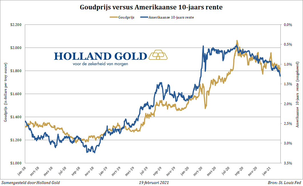 De coronacrisis zorgden vorig jaar voor een vlucht naar veilige havens. Tegelijkertijd verlaagden centrale banken de rente en begonnen ze weer op grote schaal obligaties op te kopen. Daardoor zakte de rente op staatsleningen over de hele linie naar een dieptepunt, in veel gevallen zelfs tot onder het nulpunt. Dat zorgde voor een vlucht naar edelmetalen, omdat geen rente aantrekkelijker is dan negatieve rente. De rente bleef aanvankelijk laag, maar loopt de laatste maanden gestaag op. Met name in de Verenigde Staten gaat het hard, omdat beleggers door enorme fiscale stimuleringsprogramma's meer inflatie verwachten. Daardoor vragen ze een hogere rente om hun geld uit te lenen aan de Amerikaanse overheid.