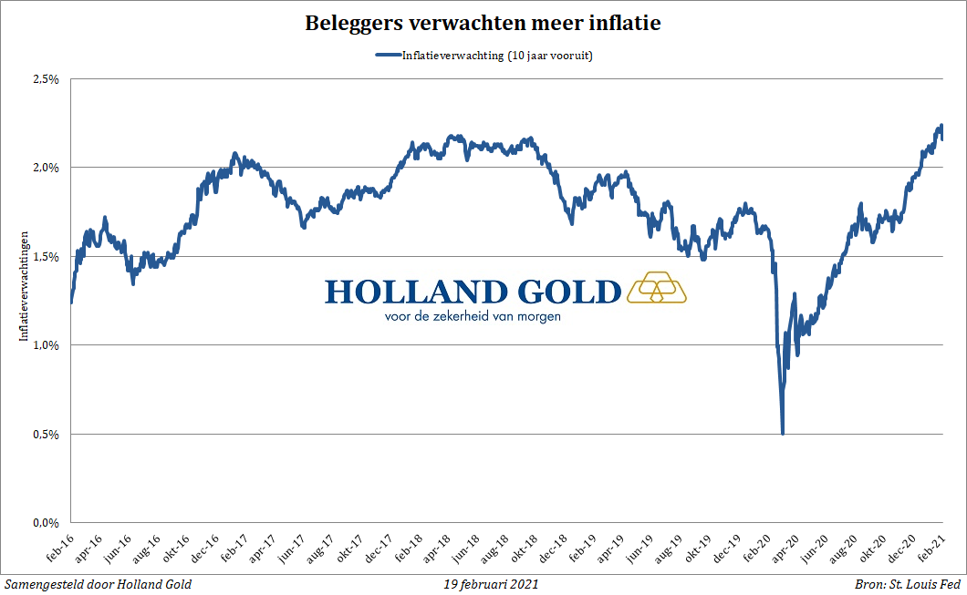 Op het moment van schrijven is de Amerikaanse 10-jaars rente ongeveer 1,3%. Dat is het hoogste niveau sinds februari vorig jaar, toen de coronapandemie van China overwaaide naar de rest van de wereld. Door de stijgende rente worden staatsobligaties aantrekkelijker ten opzichte van het edelmetaal. Onderstaande grafiek laat zien dat de goudprijs en de rente in de Verenigde Staten sterk gecorreleerd zijn. We moeten hierbij opmerken dat de reële rente - dus na correctie voor inflatie - veel minder snel stijgt. Naast de rente zijn ook de inflatieverwachtingen opgelopen.
