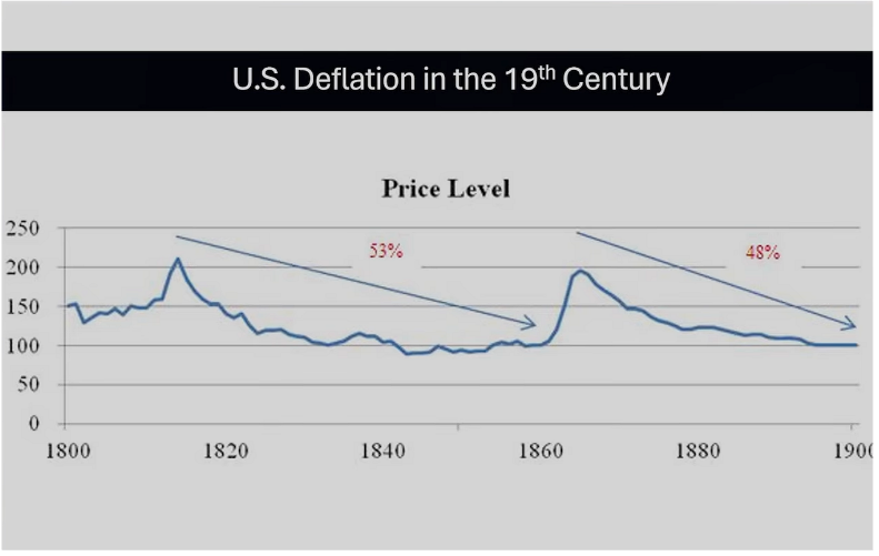 Tussen 1800 en 1900 daalden de prijzen structureel, behalve tijdens korte periodes van oorlogsfinanciering. In de periode 1870-1898 daalden de consumentenprijzen in de VS met maar liefst 48%. Volgens de huidige inflatieaannames had dit moeten leiden tot een diepe depressie.