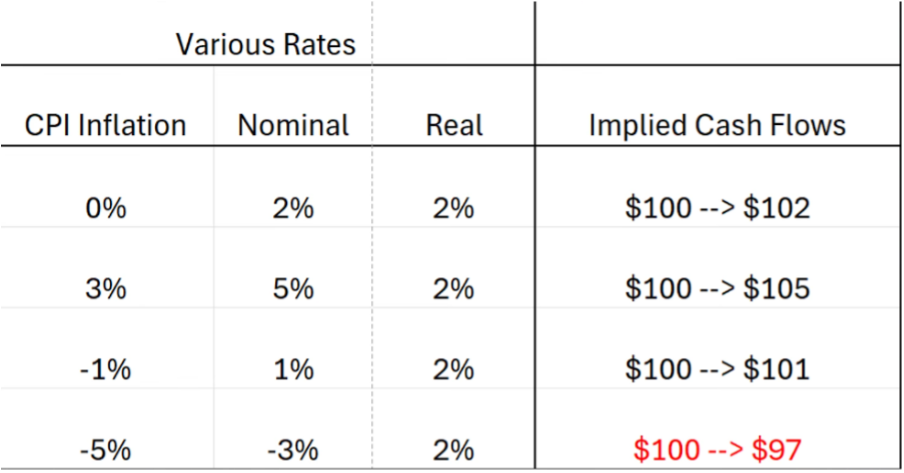 Veel economen stellen dat niemand wil investeren als geld volgend jaar meer waard is. Ze wijzen naar een voorbeeld waarbij een sterke deflatie van 5% bij een reële rente van 2% leidt tot een nominale rente van -3%. Waarom zou je immers 100 euro investeren als je er nominaal 97 euro voor terugkrijgt?