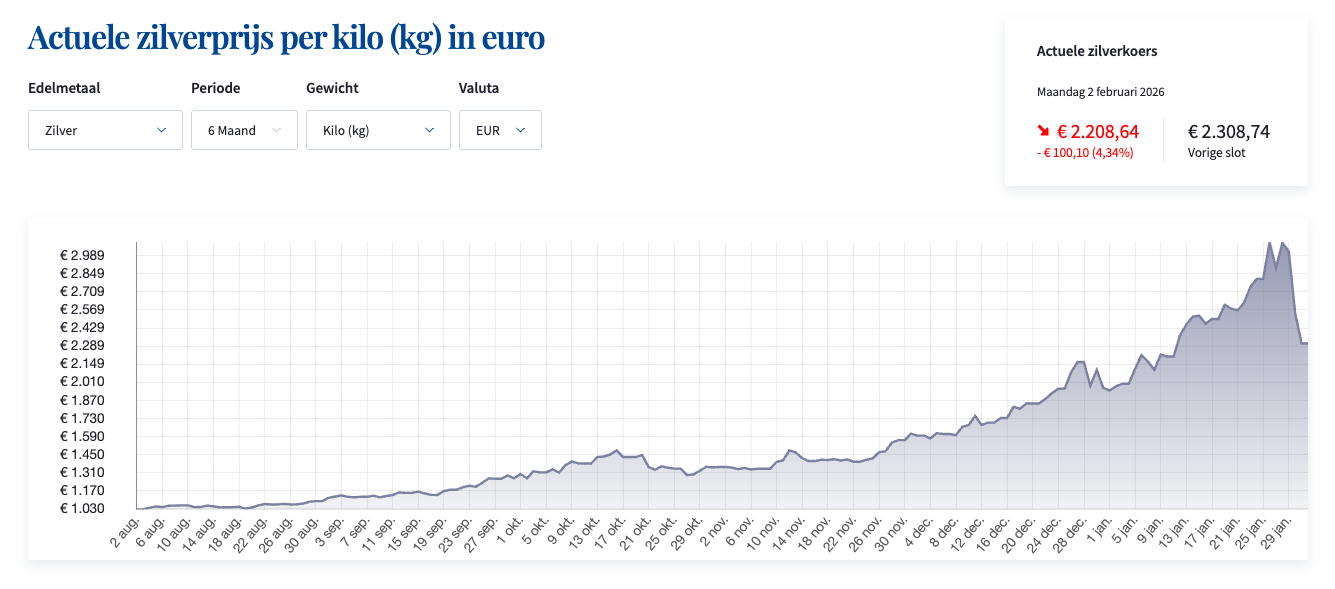 Afgelopen zomer kostte een kilo zilver nog iets meer dan €1.000. Vorige week piekte de prijs boven de €3.200, een uitzonderlijke stijging van meer dan 200 procent. Op maandagmiddag stond de prijs rond de €2.200, ruim 30 procent lager maar nog altijd een verdubbeling ten opzichte van afgelopen zomer. De zilverprijs is daarmee teruggekeerd naar het niveau van de eerste helft van januari.