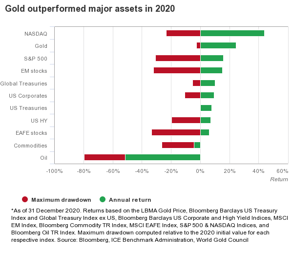 Onder deze omstandigheden blijft het aantrekkelijk om goud te bezitten. Het edelmetaal combineerde in 2020 een hoog rendement met een minimaal neerwaarts risico. Gedurende het jaar was de zogeheten drawdown, de maximale koersdaling, slechts een paar procent. Daarmee was goud minder risicovol dan aandelen, waarvan de koersen in februari en maart nog hard onderuit gingen. Op het dieptepunt stonden de aandelenkoersen zelfs meer dan 30% lager dan aan het begin van het jaar. Amerikaanse staatsobligaties kenden het laagste risico, maar leverden ook veel minder rendement op dan goud.