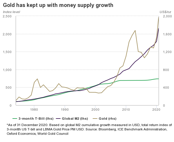 Goudprijs stijgt mee met de geldgroei (Bron: World Gold Council)