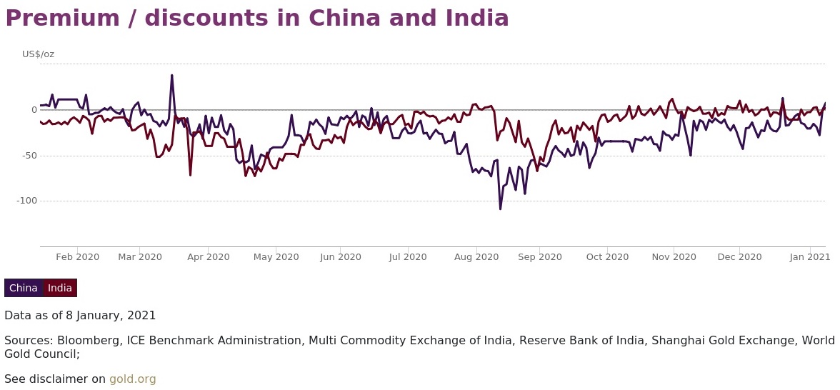 Naar verwachting zal de goudmarkt in 2021 profiteren van toenemende vraag vanuit China en India, de twee belangrijkste afzetmarkten voor fysiek goud. Door de coronacrisis was er in 2020 veel vraaguitval, omdat mensen door verlies van inkomen minder geld over hadden om goud te kopen. Sterker nog, veel mensen moesten tijdens de crisis wat goud verkopen om rond te komen. Daardoor lag de goudprijs op de lokale markt enige tijd lager dan de internationale goudprijs.