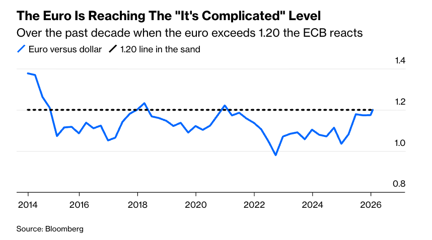 De ECB grijpt in zodra de euro te sterk wordt ten opzichte van de dollar (bron: Bloomberg)