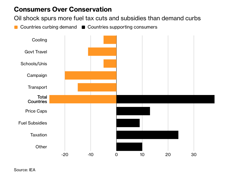 Volgens het Internationaal Energieagentschap (IEA) ligt de focus van veel overheden vooralsnog op kostencompensatie, en niet op het terugdringen van de vraag naar brandstof. Om de dreigende inflatiegolf af te zwakken, kiezen zij ervoor de prijsstijgingen te beperken door middel van een recordvrijgave van strategische olievoorraden en het verlagen van belastingen. 38 landen hebben ervoor gekozen om de kosten van brandstofverbruik te verlagen, 26 landen hebben maatregelen genomen om het verbruik zelf te beperken.