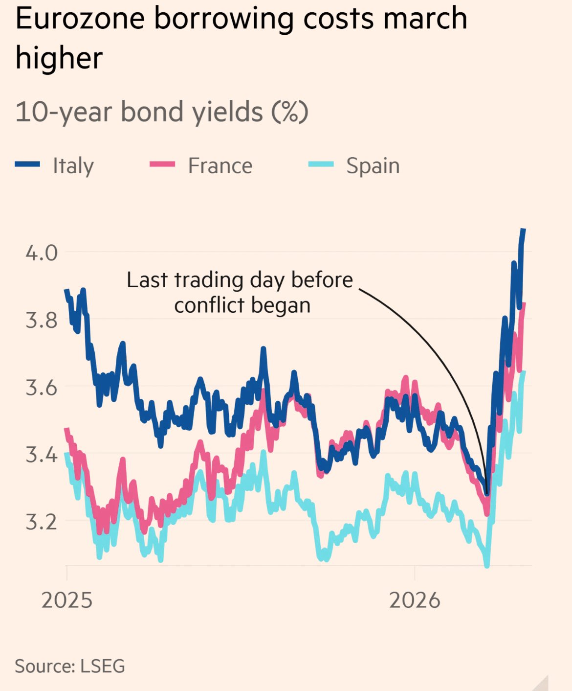 Stijgende rentes op staatsleningen sinds het begin van het conflict (bron: FT)