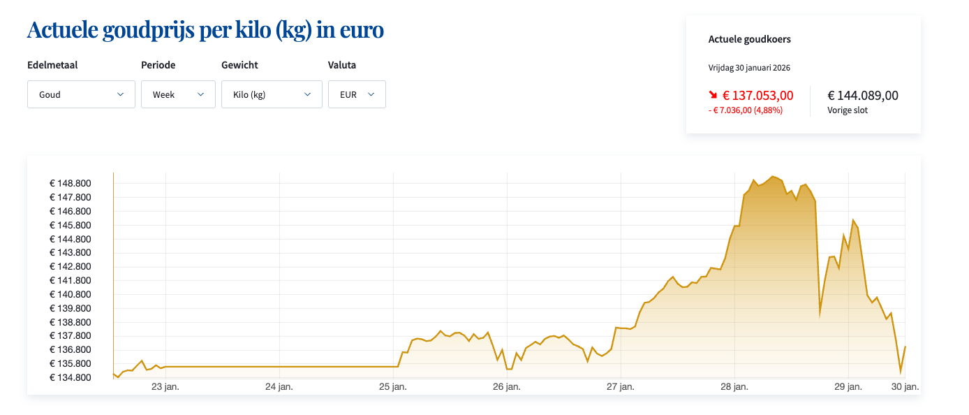 Het was een ongekende week op de edelmetaalmarkt. Vorige week vrijdag 23 januari stond de goudprijs nog rond de €135.000 per kilo. Op donderdag 29 januari bereikte goud een nieuw prijsrecord van bijna €150.000 per kilo (ruim $5.500 per ounce), om vervolgens vandaag weer terug te zakken naar het niveau van afgelopen week.