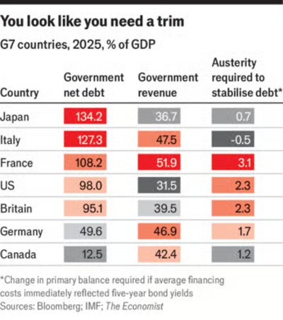 Om de schuldenniveaus in landen als Groot-Brittannië, Frankrijk en de Verenigde Staten in bedwang te houden zijn bezuinigingen nodig tussen de 2 en 3% van het bbp. Het lastige is alleen dat belastingen in Europa al hoog zijn, wat het moeilijk maakt om deze te verhogen zonder veel economische schade aan te richten. Tel daarbij de komende golf van uitgaven voor vergrijzing, defensie en klimaat op en je zit met deze landen in een lastige situatie.