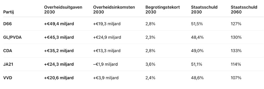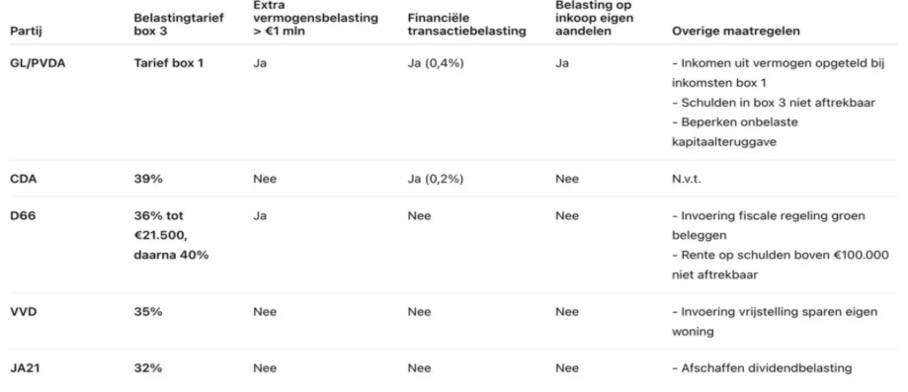 Website Stockwatch.nl zocht het uit en kwam tot de conclusie dat van de winnende partijen enkel JA21 in haar plannen de belasting in box 3 sterk wil verlagen. De partij onder leiding van Joost Eerdmans wil het belastingtarief verlagen van 36% naar 32%. Het CDA en D66 willen dit tarief juist verhogen en VVD laat het tarief van 35% ongemoeid. De overige intenties van de politieke partijen richting beleggers treft u in onderstaande tabel: