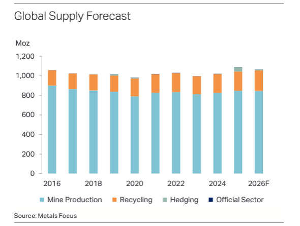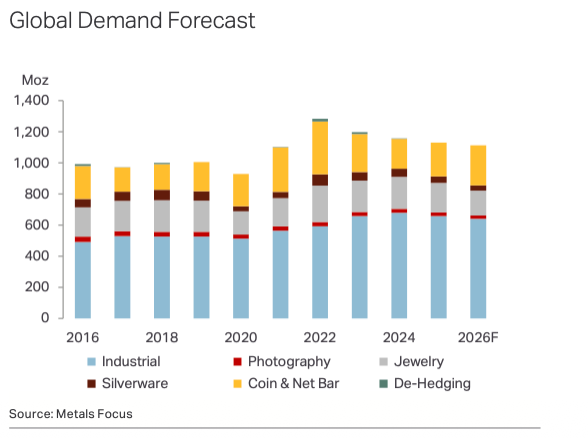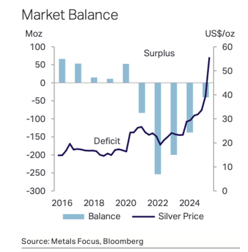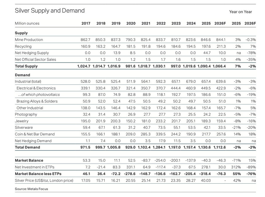 Zilvertekorten zullen in 2026 met 15% toenemen als gevolg van een dalend aanbod van zilver. Het netto tekort zal oplopen van 40,3 miljoen troy ounce zilver naar 46,3 miljoen, volgens de verwachting van Metals Focus. Dit is het werkelijk tekort op basis van vraag uit de industrie en juwelierssector enerzijds en aanbod van mijnbouw en recycling anderzijds.