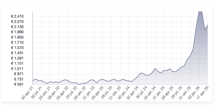 In 2025 zagen we de zilverprijs van €896 per kilo stijgen naar €2.104 per kilo, een toename van 134%. Een spectaculaire prijsstijging die gedreven werd door een zogenoemde zilversqueeze vanaf oktober 2025. Deze squeeze was al langer in de maak, door opeenvolgende jaren van zilvertekorten. In 2025 kwam alles samen: dalende zilvervoorraden, onttrekkingen aan de Londense zilverbeurs en enorme vraag vanuit ETP’s (Exchange Traded Products), ook wel bekend als papieren zilver of handel in zilvercontracten zoals ETF’s en ETC’s.