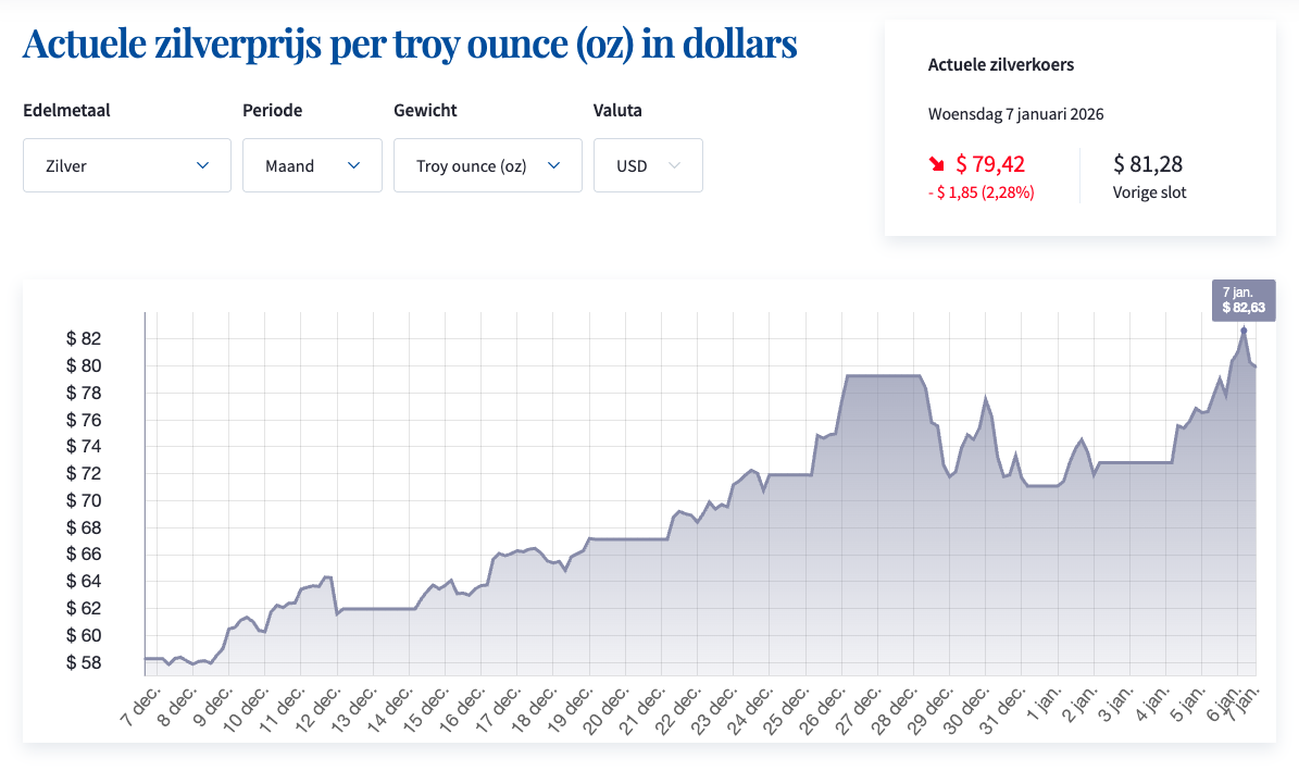 Vannacht 00:55 piekte zilver opnieuw, op prijzen van € 70,73 en $ 82,78 per troy ounce respectievelijk. Volgens sommige koersnoteringen een nieuw prijsrecord, maar vlak na de kerst zagen we door explosieve vraag vanuit China bij de Shanghai Gold exchange een kortstondige notering van $84 per 31,1 gram puur zilver. Zilver had op dat moment in dollars al een prijsstijging van 150% doorgemaakt in 2025. Diezelfde 29 december zagen we een correctie van 9% procent, een van de grootste correcties die zilver ooit doormaakte.
