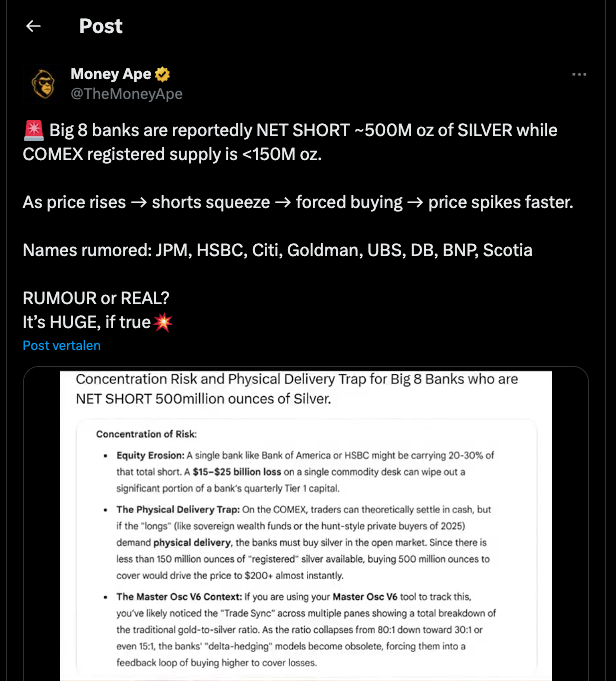 Geruchten over zilvertekorten bij grote banken, die marktmanipulatie zouden uitlokken (bron: X)