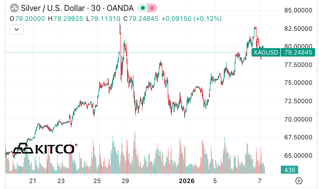 In de eerste zeven dagen van 2026 klimmen zilverprijzen weer richting de piek van eind 2025 (Bron: Kitco)